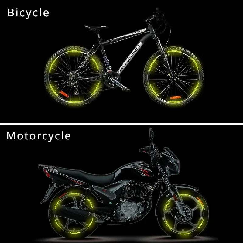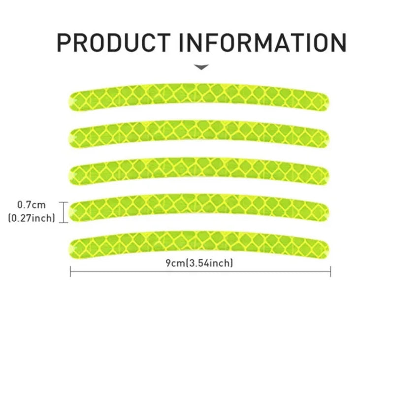 Pakkaus sisältää: 20 kpl heijastavia tarroja renkaisiin
